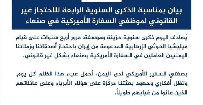 السفير الأمريكي يدين استمرار مليشيات الحوثي في احتجاز موظفي السفارة بصنعاء منذ أربع سنوات