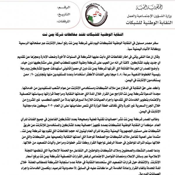 نقابة الشبكات تفند مغالطات شركة يمن نت وتدعو للتصعيد
