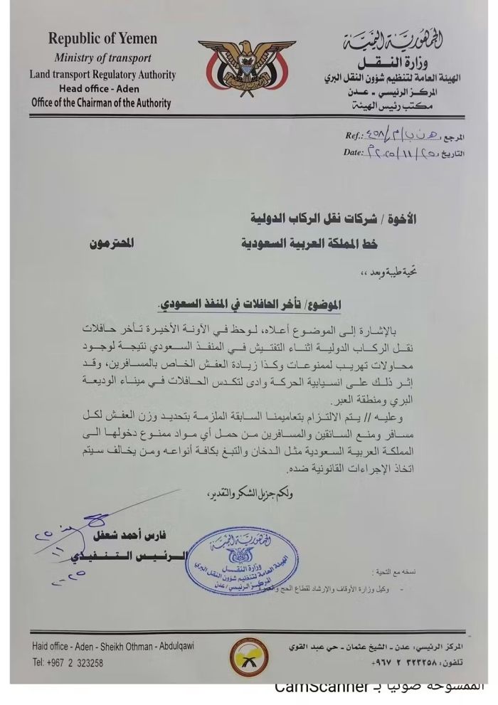 عدن .. النقل البري يوجه بتحديد وزن الحقائب لتجنب التأخير بمنفذ الوديعة