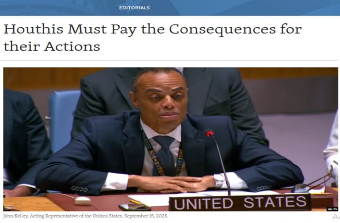John Kelley, Acting Representative of the United States to the United Nations told the Security Council that over the past month, the Houthis, with the backing of Iran, continue to demonstrate the threat they pose to navigational rights at sea, stability in the region, and the welfare of the Yemeni people. He added that on August 31, the Houthis unlawfully detained at least 21 UN staff from their offices and homes.