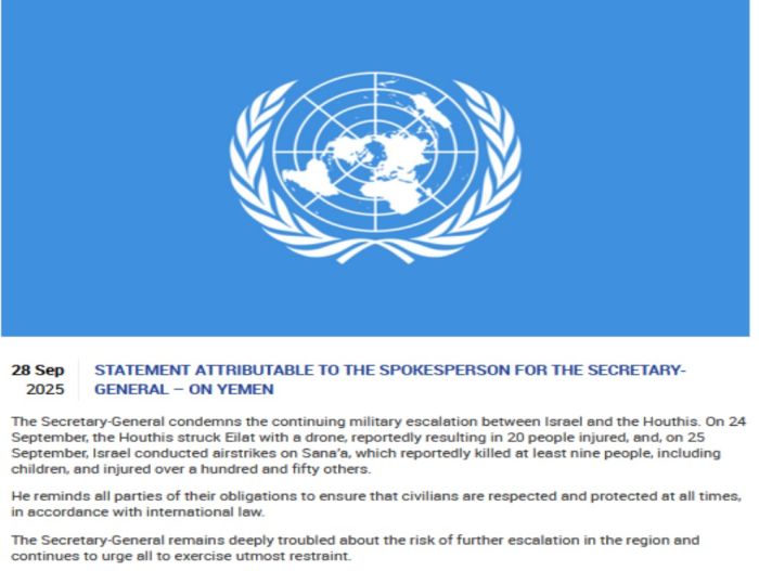 The Secretary-General of the United Nations condemns the continuing military escalation between Israel and the Houthis.