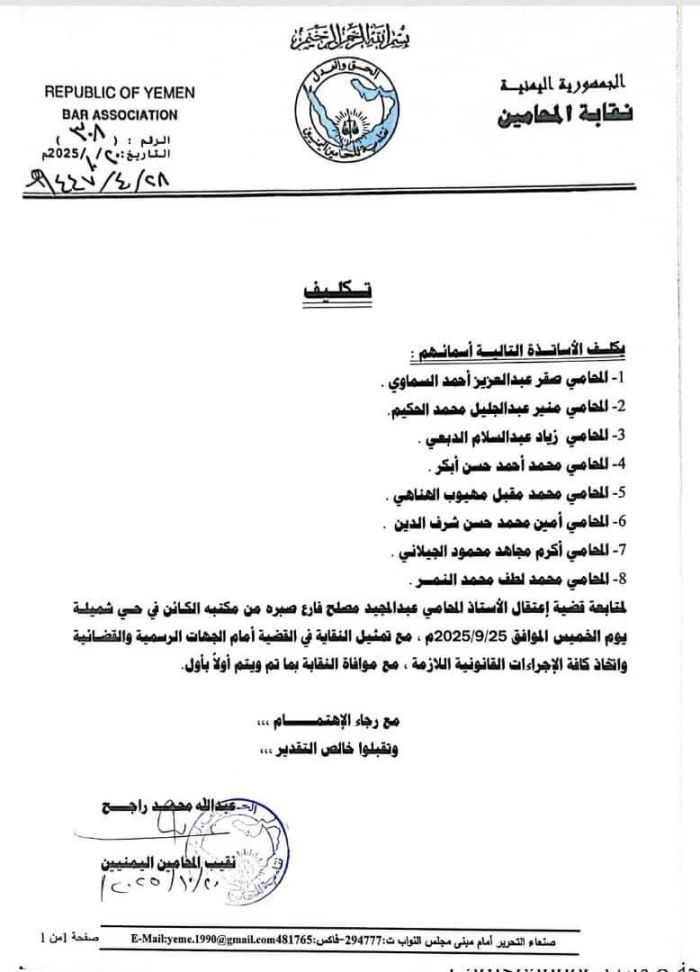 الوثيقة صدرت بتوقيع نقيب المحامين اليمنيين المحامي عبدالله محمد راجح.