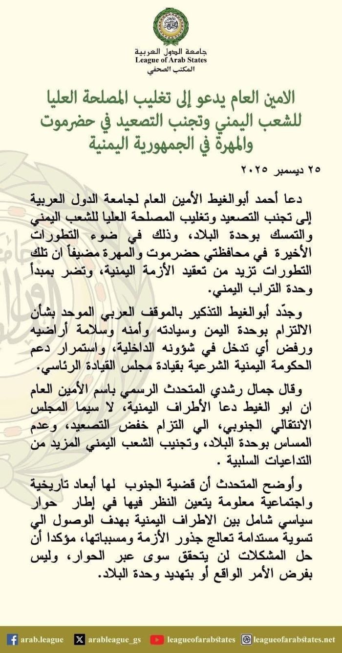 دعا الأمين العام لجامعة الدول العربية، أحمد أبو الغيط، إلى ضرورة تجنب التصعيد وتغليب المصلحة العليا للشعب اليمني، مؤكداً على أهمية التمسك بوحدة البلادجاء ذلك في بيان رسمي للمكتب الصحفي للجامعة تعقيباً على التطورات الأخيرة في محافظتي حضرموت والمهرة.