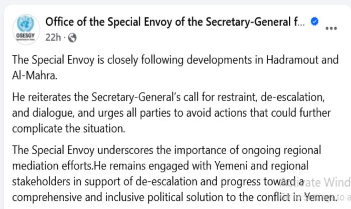 The Office of the United Nations Secretary General Special Envoy to Yemen, Hans Grundberg, issued a statement of his behalf stating that he is closely following the ongoing developments in Hadramawt and Al Mahra.