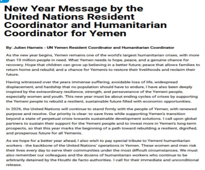 He reiterated that “In 2026, the United Nations will continue to stand firmly with the people of Yemen, with renewed purpose and resolve”, and that the UN priority is clear: to save lives while supporting Yemen’s transition beyond a state of perpetual crisis towards sustainable development solutions.